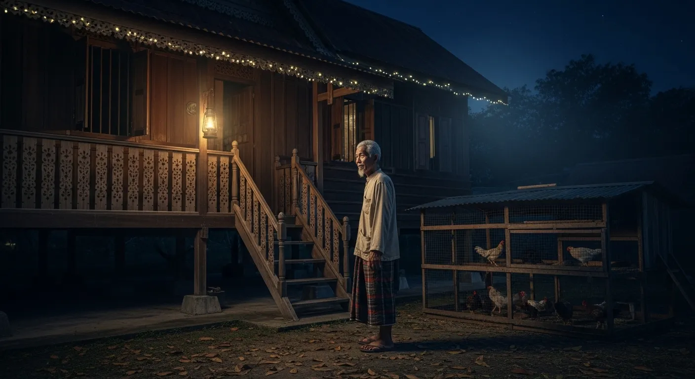 Vibe pelik dah mula mengelilingi minda Paktam. Diteropongnya lagi dan terlihat ada pergerakan yang turun dari pokok durian. Pergerakan seakan selimut merangkak sambil melekat dibatang pokok. Seolah spiderman. Tapi yang turun tu kain selimut yang ada kaki dan tangan yang panjang. Faham kan? Seakan slenderman berselimut. Entiti tu merangkak turun dari pokok durian dan terus rentap perut ayam yang tergantung kukuh didahan. Bergoyang goyang daun dan dahan pokok dengan rentapannya itu.