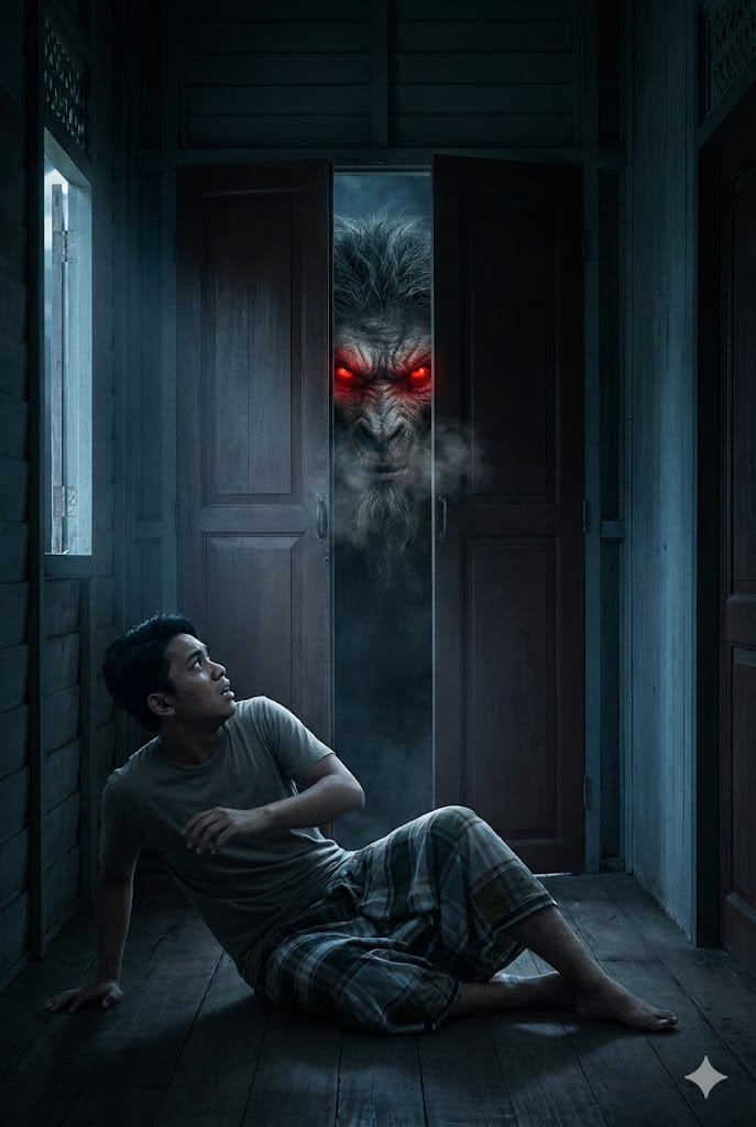Pintu aku nih jenis dua pintu, tengah tengah tuh ada lubang yang boleh nampak luar. Time nak kunci pintu tu dia gatal sangat nak tengok luar then bila dia tengok je luar betul betul mata merah tuh depan mata dia, and genderuwo tuh mendengus dengan kuat sampai abang aku terpelanting ke belakang sebab terkejut and dia dah terduduk ketakutan. Dengan kudrat yang tinggal ciput tuh dia bangun terus lari ke bilik dia.
