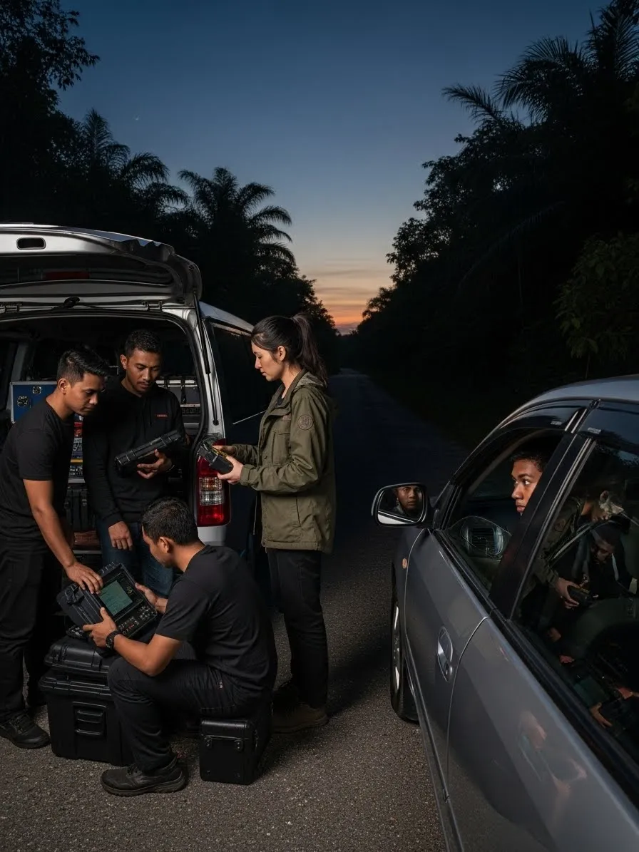 Setibanya di sana, suasana sangat hening. Pasukan ini mula mengeluarkan peralatan canggih seperti meter pengesan frekuensi elektromagnetik (EMF). Saya hanya memerhati dari cermin tingkap kereta yang tertutup rapat.