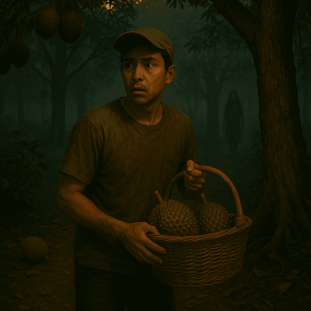 Aku berdiri tegak, cuba fokus. “Budak siapa pulak ni?” fikir aku. Tak mungkin budak kampung sebab semua dah kenal aku, dan lagi satu… siapa main dalam kebun durian waktu senja macam ni?