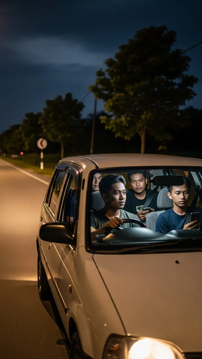 Jam hampir pukul 12 malam. Dengan kancil cikai, ada aku dan 3 lagi rakan lain. Tapi awal-awal bertolak, aku tak drive. Aku bagi kat member lain drive. Aku rest kat belakang dengan sorang member lagi. Biarkan dua lagi kat depan tu sembang-sembang. Aku akhirnya terlelap dengan member sorang lagi kat belakang. Kroh kroh.