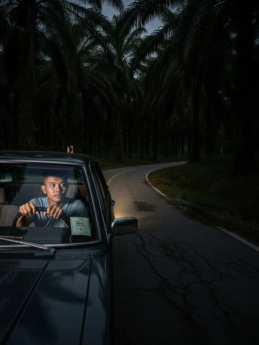 Tanpa arah tujuan, aku nekad untuk memandu terus mengikut gerak hati. Aku memasuki sebuah jalan lama yang diapit oleh ladang kelapa sawit di kiri dan kanan. Suasana sangat sunap. Hanya lampu kereta aku yang membelah kegelapan malam yang pekat.