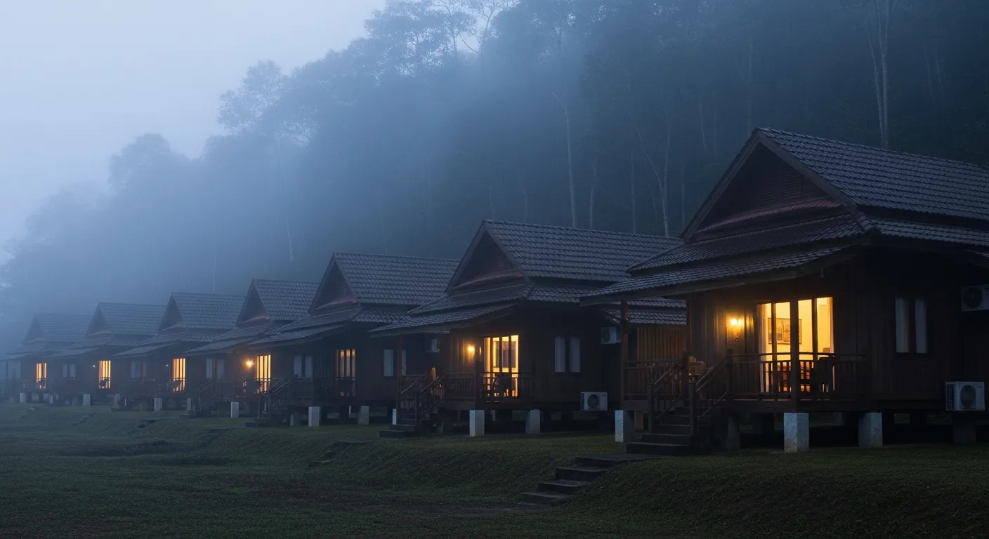 Kami tiba di lapangan terbang sekitar jam 9:30 malam dan terus menyewa kenderaan untuk menuju ke destinasi. Perjalanan ke resort tersebut agak mencabar kerana lokasinya yang tersorok di pinggir hutan simpan. Suasana malam yang pekat dan jalan raya yang sunyi membuatkan kami beberapa kali tersalah simpang. Hampir sejam kami berpusing-pusing sebelum akhirnya tiba di pintu gerbang resort tersebut sekitar jam 11 malam. Sebaik melangkah masuk, perasaan saya mula tidak enak. Walaupun seni binanya cantik dengan konsep kayu-kayuan tradisional, namun pencahayaannya sangat suram. Kabus nipis mula turun dari lereng bukit, menyelubungi deretan chalet yang dibina agak jauh antara satu sama lain.