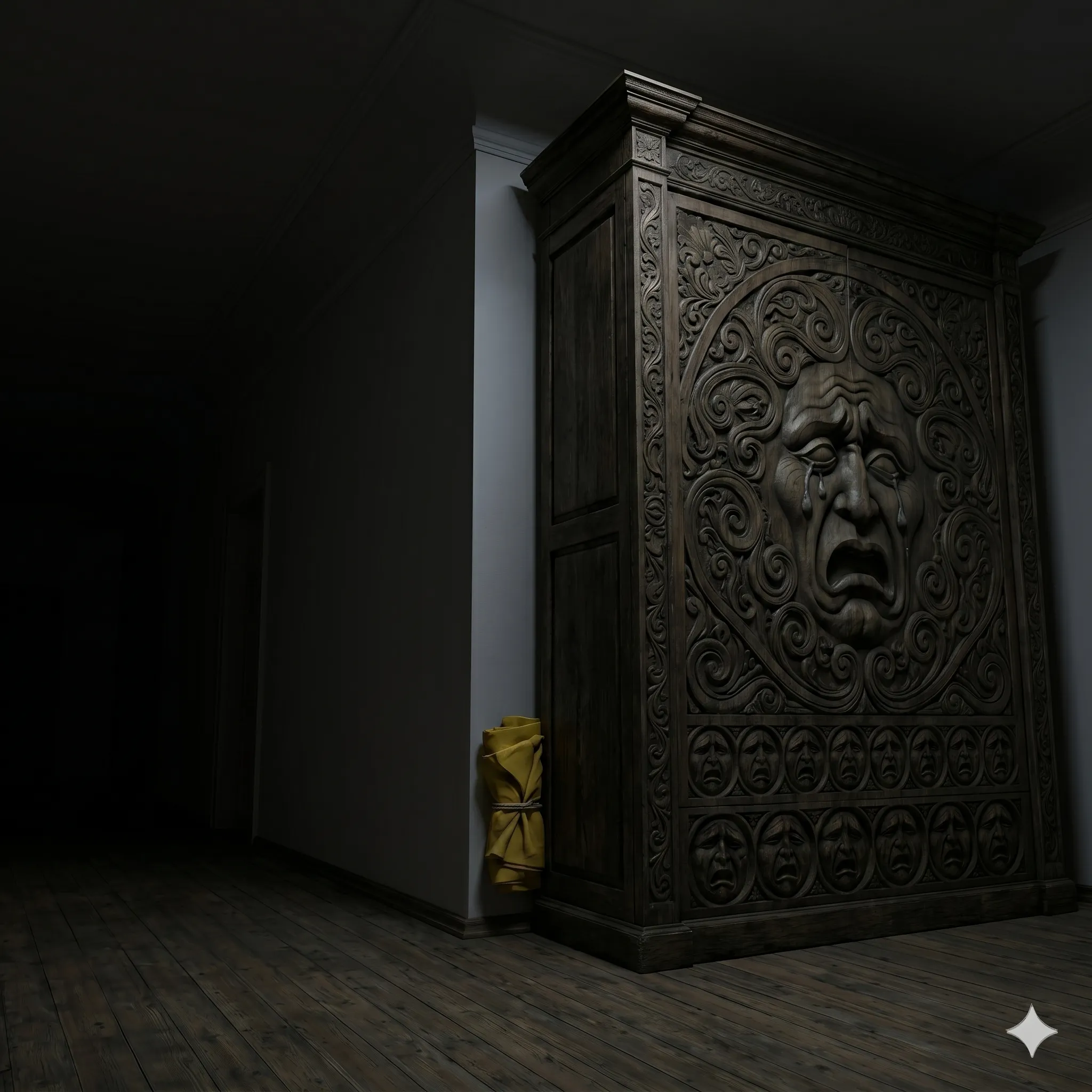 Bilik yang kami sewa terletak di tingkat atas. Biliknya sangat luas tetapi memanjang, dan yang paling menarik perhatian kami adalah sebuah almari jati antik yang sangat tinggi, mencecah siling. Ukirannya sangat halus namun nampak menyeramkan, seperti motif wajah yang sedang menangis. Walaupun hati berasa tidak enak, kami tetap membayar deposit kerana harganya yang sangat murah untuk kawasan elit sebawah itu.