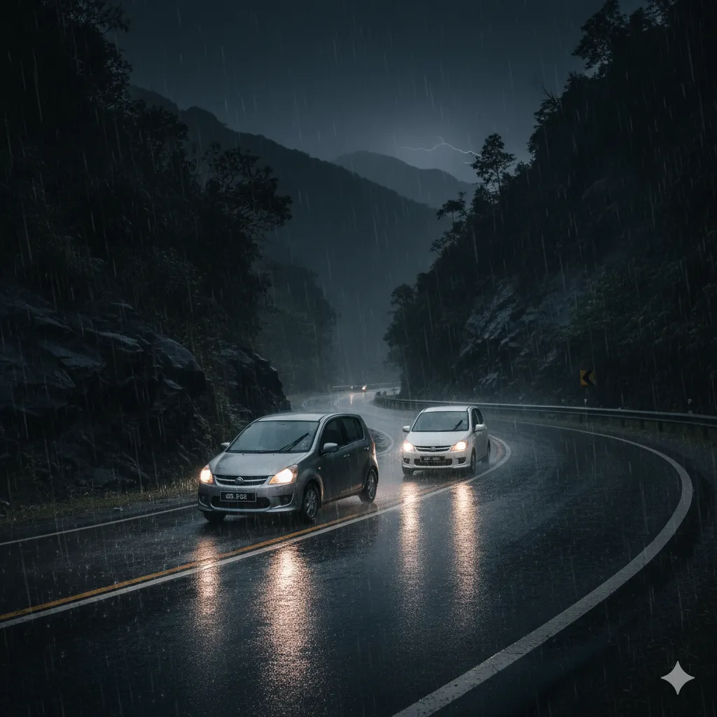 Ketika sampai di suatu tempat yang berbukit, hujan tiba-tiba turun dengan lebat. Pemandangan terhad.Kami berselisih dengan sebuah kereta. Dia memberi isyarat ‘lampu tinggi berulang kali. Seolah2 ada kecemasan di hadapan. Kemudian ada sebuah lori 1 tan memotong kereta kami dan entah kenapa membunyikan hon beberapa kali. Terkejut mak! π