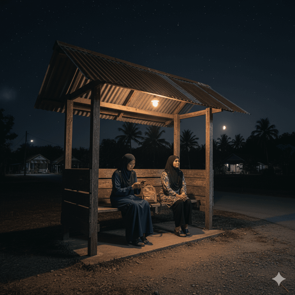 Perhentian bas itu diperbuat daripada kayu, dengan bangku yang sudah usang dan atap zink yang berkarat. Ia kelihatan seperti sudah lama ditinggalkan. Kami menggelarnya “Perhentian Bas Hantu”. Kami seringkali menunggu di situ pada waktu senja, dan ia sentiasa terasa menyeramkan.