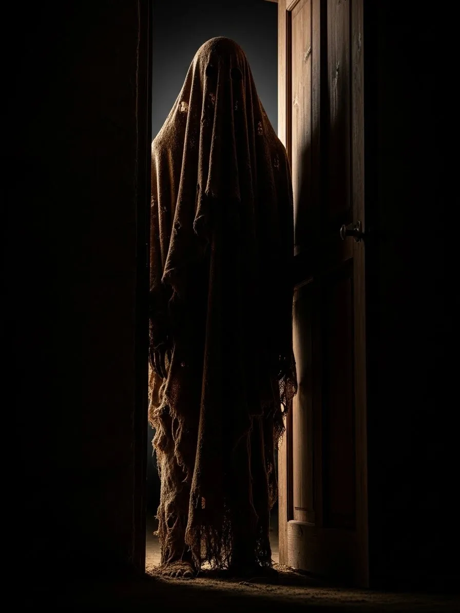 Aku buka mata dan badanku terus kaku. Di celah daun pintu yang terbuka sedikit, ada satu susuk berdiri tegak. Ia bukan manusia. Ia adalah pocong yang kain kapannya sudah coklat kehitaman, seolah-olah sudah lama tertanam di tanah lembap.
