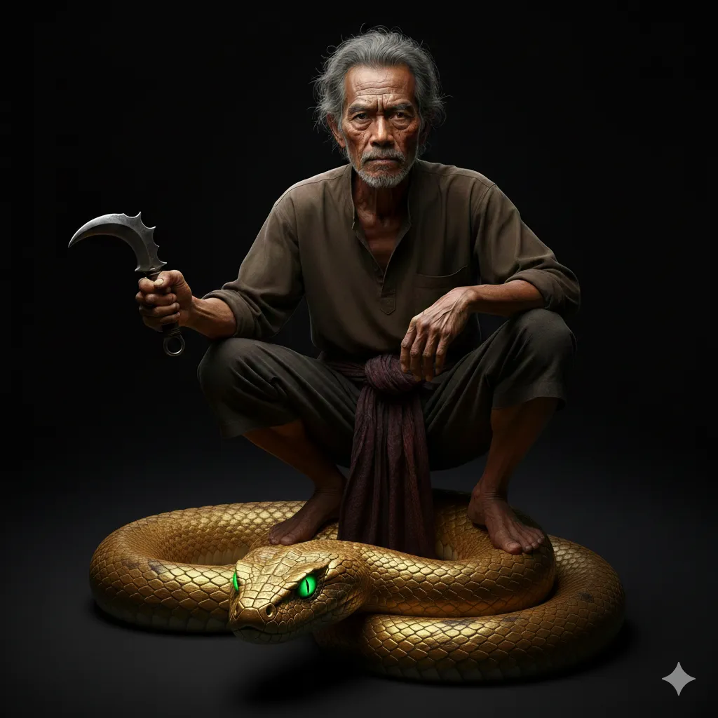 Tapi bila tangan aku baru nak menghulur, tiba-tiba satu kepala ular muncul dari celah lingkaran tu. Sisiknya di bahagian kepala kasar macam kulit buaya, warnanya emas berkilau, tapi matanya hijau neon. Aku melompat macam nangka busuk, terus lari ke dapur ambil garam dan kayu penyapu. Bila aku datang balik, benda tu dah hilang. Atuk yang tadinya tidur, tiba-tiba bersuara tanpa buka mata, “Dia dah pergi… jangan diganggu.”